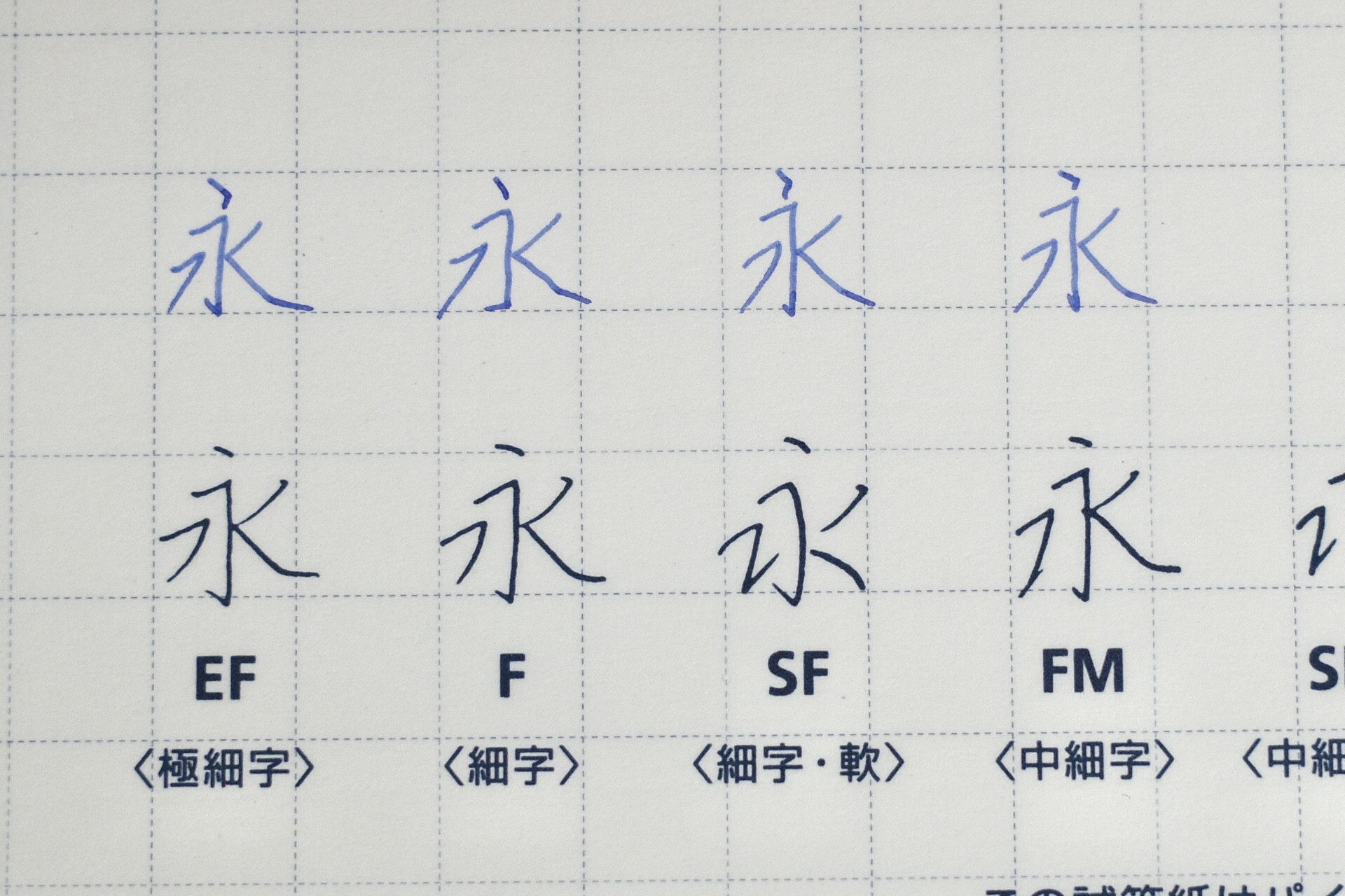 画像の「永」の字はすべてエクリプスM中字で書いています。筆圧を抜けばF細字くらいにも書けますし、筆圧を入れるともっと抑揚が出せます。筆記してみるとこのペン先の表現の幅が広いことがすぐわかるので、書いていて楽しいです。