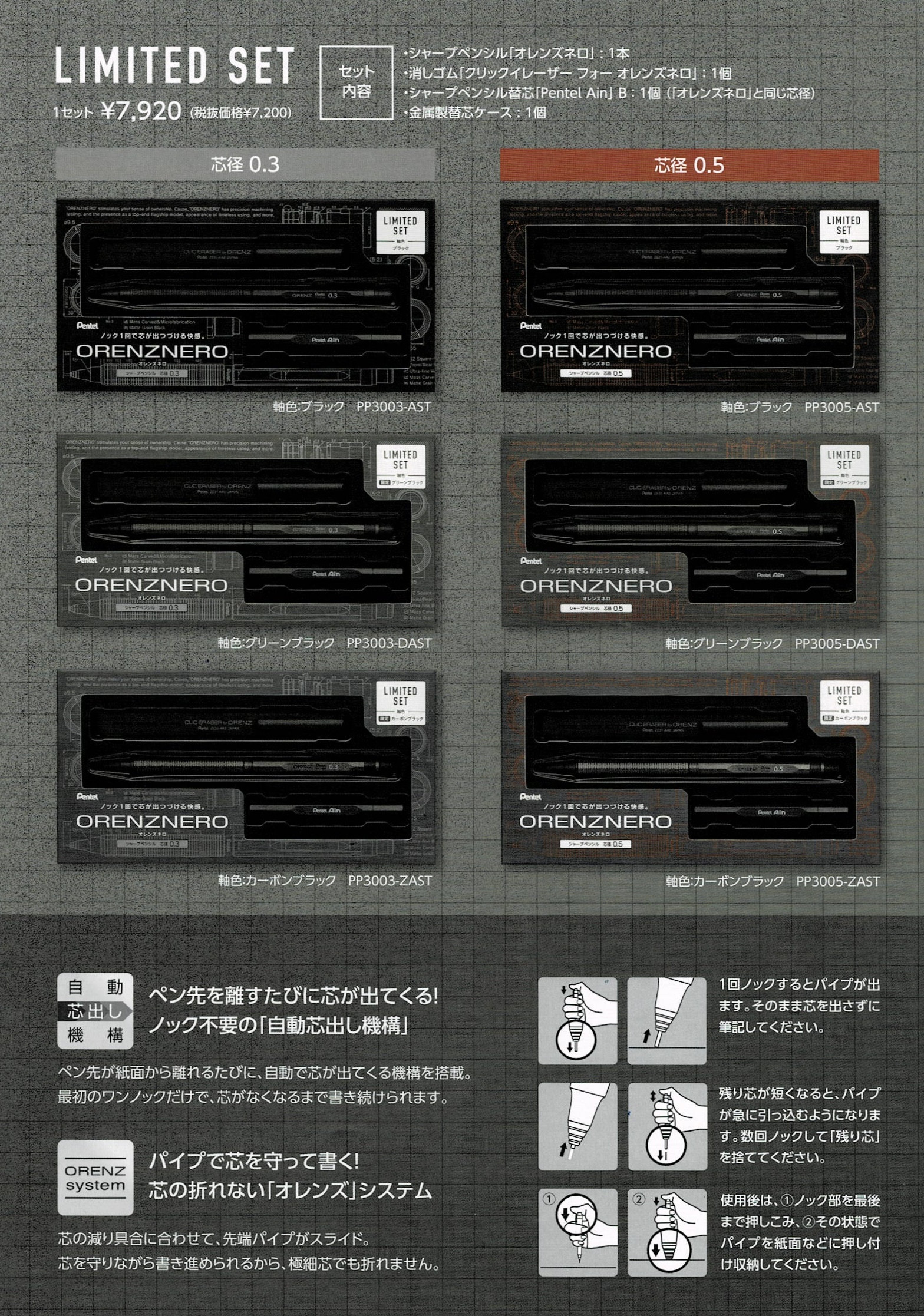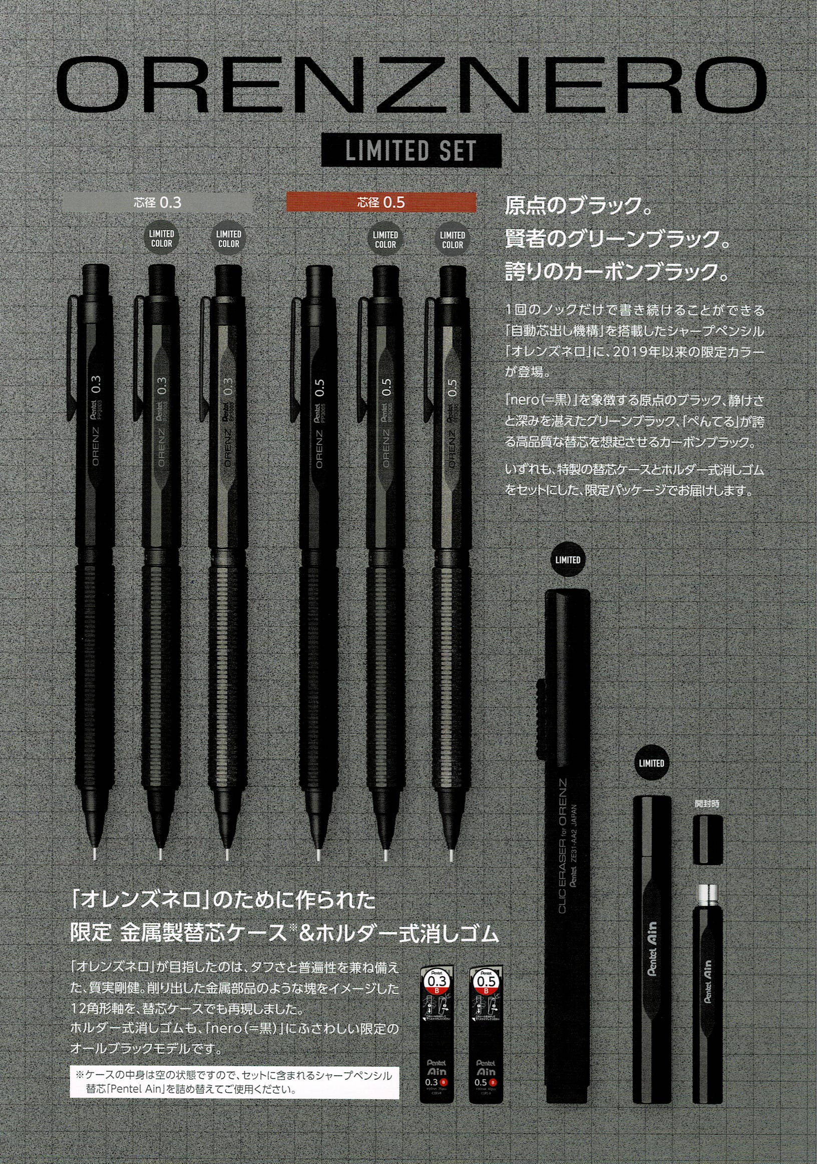 今回のセットでしか入手できない「金属製オリジナル芯ケース」、オレンズネロカラーのプロ仕様ホルダー字消し「クリックイレーサー」が同梱されています。